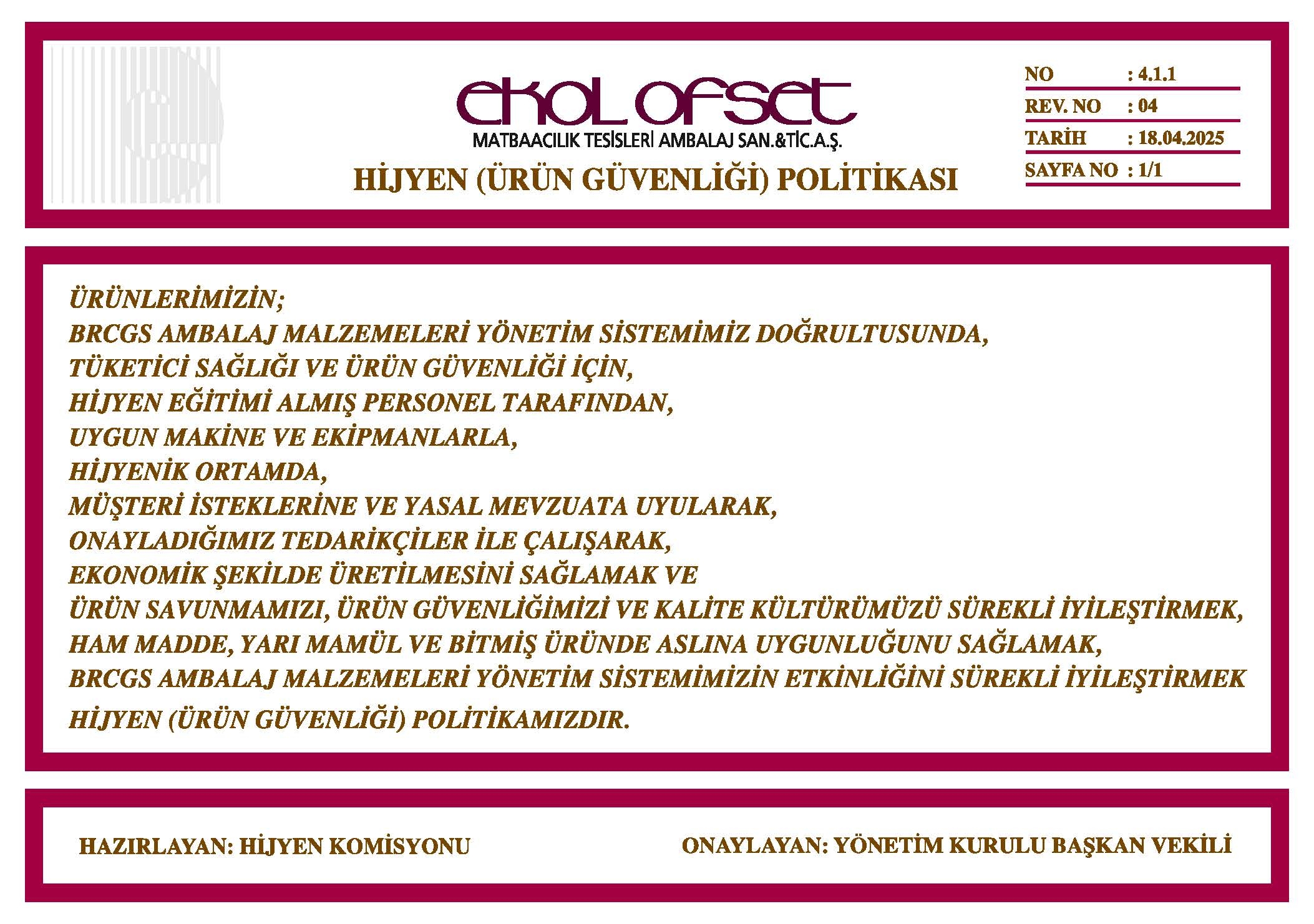 Bu bilinçle Ekol Ofset, bünyesinde çalışan Kalite Müdürü, Gıda Kodeksinden sorumlu Müdür, İş Sağlığı ve Güvenliği Uzmanı, Çevre Mühendisi (Çevre Görevlisi), 15 kişilik Kalite kontrol ekibi ve diğer pozisyonlardaki personeli ile, yönetim sistemleri çalışmalarını başarıyla yürütmektedir.